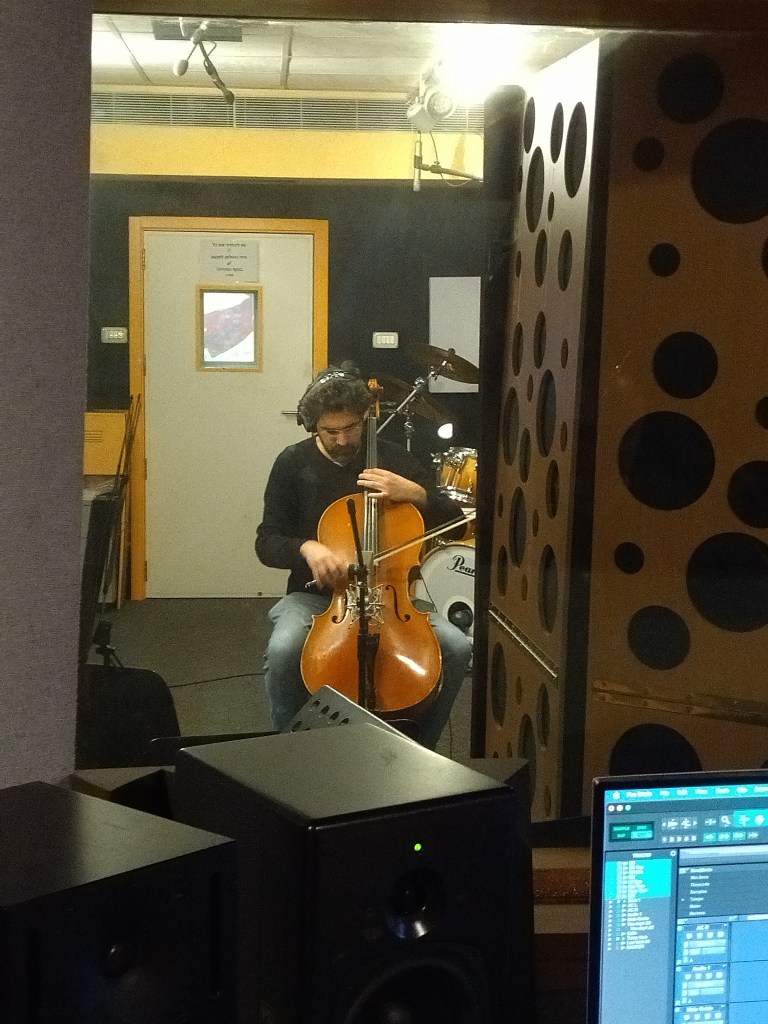 בתמונות למטה: הצ'לן יונתן ניב, ולידו יואב רומם מציב את המיקרופון.